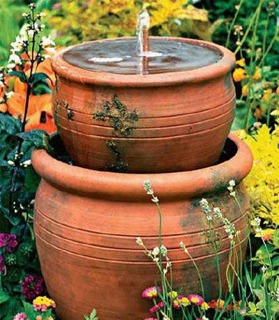在庭院或者露臺一角安置一座小噴泉,掩映在植物叢中,傳來隱隱的水聲。在園藝市場中有各種成品可供選擇,只要附近的位置有電源就可以了。如果你沒有特別的要求,一個中意的容器,一個小水泵,一段水管就可以完成制做了。